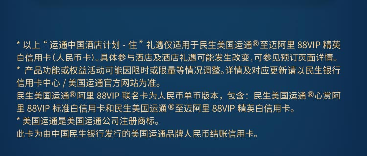 - 因申请民生美国运通®阿里88VIP联名卡(人民币单币版)而首次成为民生信用卡主卡的新客户。
