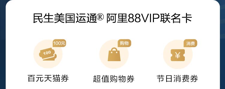 - ③2022年“年货节”(具体日期待揭晓)期间,持卡人持民生美国运通®阿里88VIP联名卡(人民币单币版)通过支付宝绑定该卡片,在天猫累计消费满888元,可获得88元天猫购物券,每位客户活动周期内限参加一次,且共限3000个名额,权益将于次月8日上午10点针对达标的用户开放领取,先到先得。