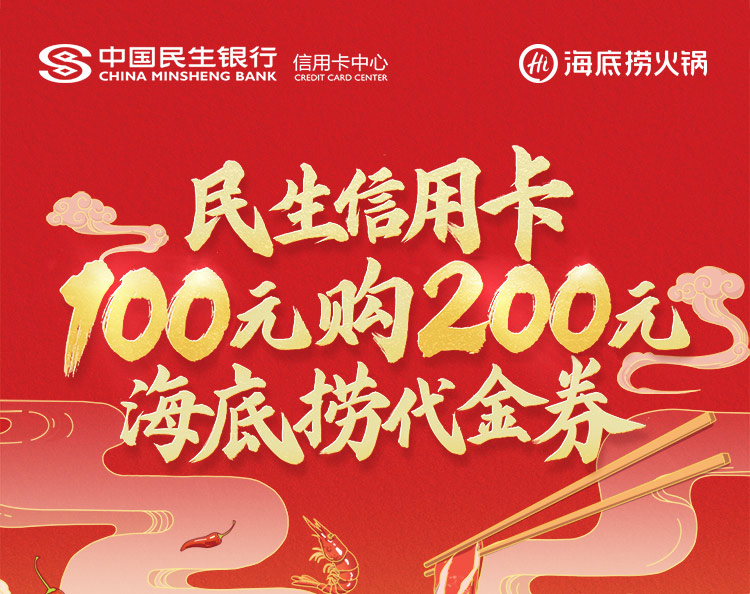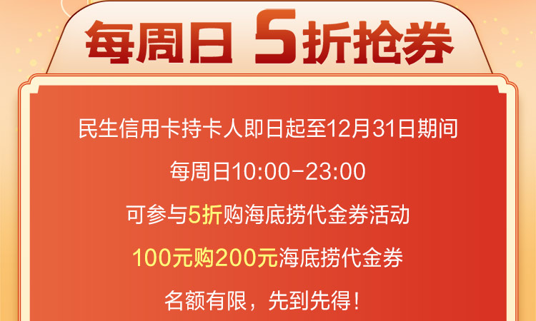 1)即日起至2021年12月31日期间的每周日10:00-23:00,民生信用卡持卡人(以下简称“持卡人”)通过"全民生活APP"-惠买单-海底捞,购买海底捞代金券,可享受民生信用卡支付人民币100元购买海底捞200元代金券的优惠。每名持卡人每月限购买一次,每次限一张,活动期间最多可购买二次。