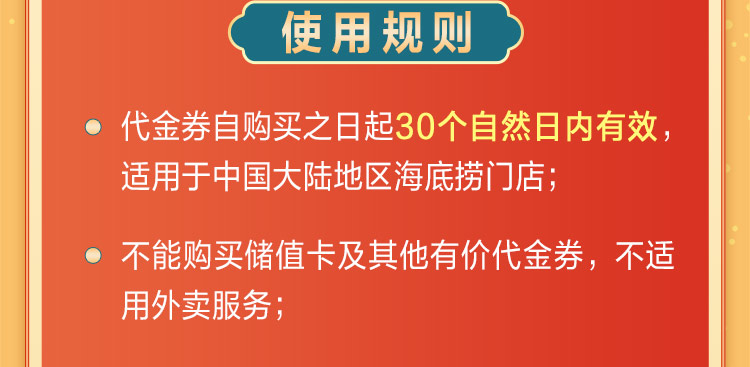 4)代金券自购买之日起30个自然日有效。有效期内持卡人可到海底捞指定门店使用(不适用于外送、外卖打包,且不能兑换现金、卡券等、不设找零;不适用于购买各门店礼品卡、储值卡和代金券等有价凭证类产品)。券码有效期内持卡人可在线申请退款。退款成功后,持卡人支付的现金部分将在3个工作日内返还至原支付账户,持卡人将失去本月购买资格。未使用的券码超出有效期后,系统将在3个工作日进行退款,持卡人支付的现金部分将返还至原支付账户。