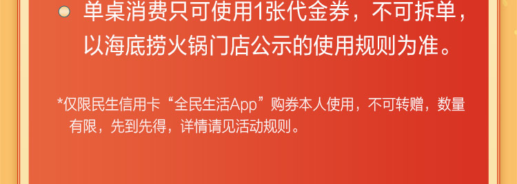 5)本次活动只针对个人消费行为,团购、单位或批发消费无法参加此次活动。该代金券仅限海底捞中国大陆地区门店堂食使用。如发现有恶意套利、影响其他用户消费的情况,民生银行及海底捞有权拒绝使用。