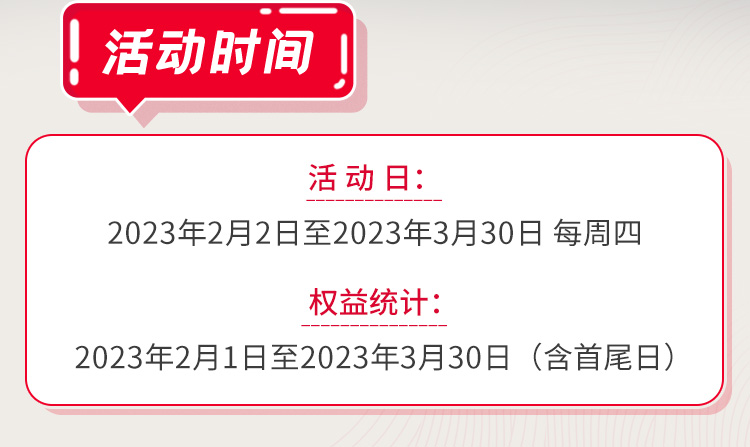 - 1. 周四活动日:2023年2月2日、2月9日、2月16日、2月23日;3月2日、3月9日、3月16日、3月23日、3月30日,共计9个活动日