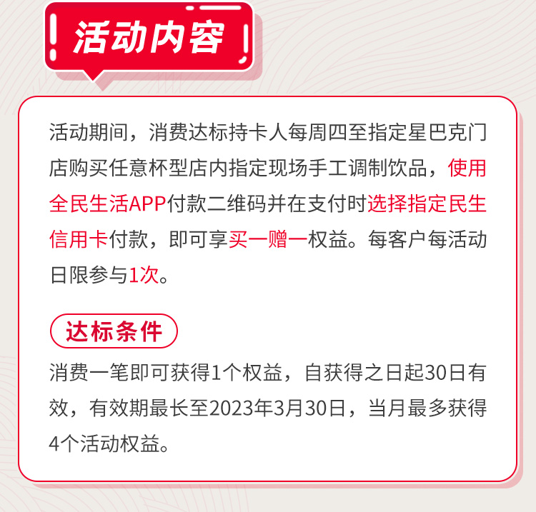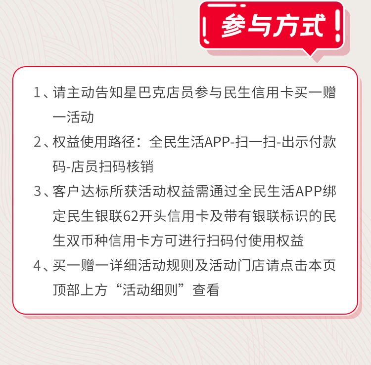 - 1) 请使用前主动告知星巴克店员参与民生信用卡买一赠一活动;