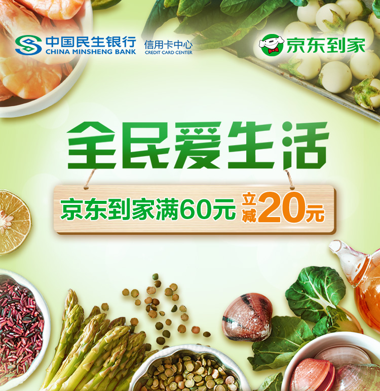 - 3.本活动适用于“京东到家APP”或“京东APP-京东到家频道”消费,并使用已实名认证的京东账户中的民生信用卡京东支付方可享受优惠,使用微信支付、Apple Pay、京东白条、云闪付、找人代付等支付方式不可享受优惠。由于版本限制,请持卡人将APP更新至最新版本。