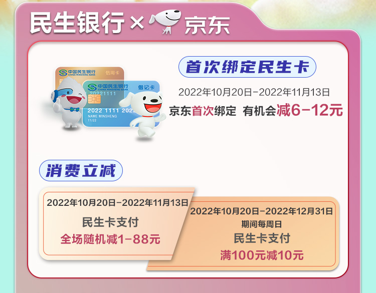 在京东支付已经绑定民生银行借记卡或信用卡的用户在京东商城(APP/网页版)、京东到家等指定平台购买实物类部分商品(特例商品除外),在支付时可选择使用民生银行卡完成在线支付(不支持代付类型),即有机会享受单笔订单商品应付金额随机立减1元—88元。