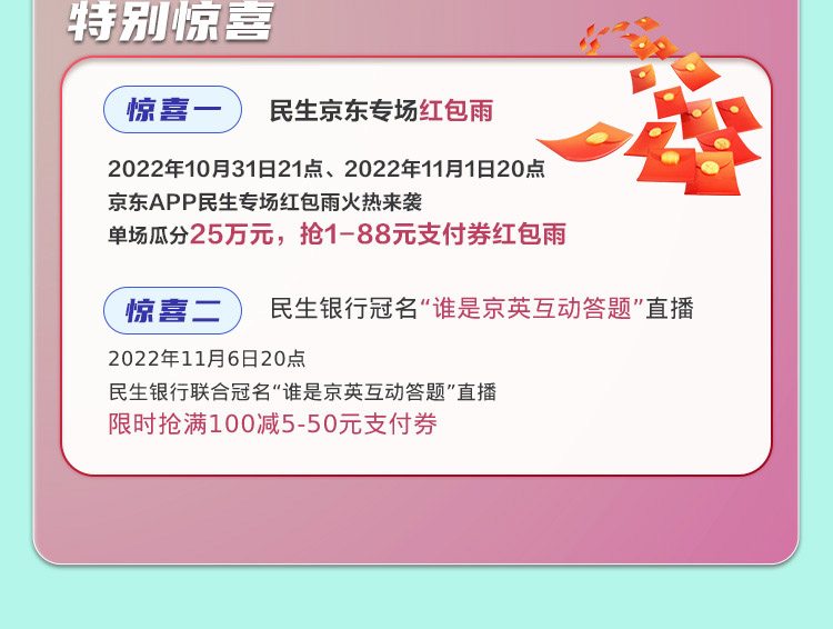 参与方式:活动期间,民生银行借记卡或信用卡持卡人有机会通过参与积分答题的形式,在谁是京英指定活动页面(含11月6日京东直播间)通过答题积分来兑换满100元随机减5-50元的京东支付券,或者11月6日当天,民生银行借记卡或信用卡持卡人有机会在青绿会场指定页面兑换满100元减5-20元优惠券。支付券限使用已绑定的民生银行卡购京东商城(APP/网页版)平台购买实物类订单或话费充值(特例商品除外)使用(不支持代付类型)。