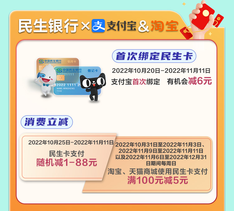 活动内容:活动期间,民生银行卡客户在淘宝APP的天猫、淘宝商户购物使用民生银行信用卡或借记卡通过支付宝进行付款,单笔实付金额满100元有机会享立减5元优惠,单笔最高立减5元。