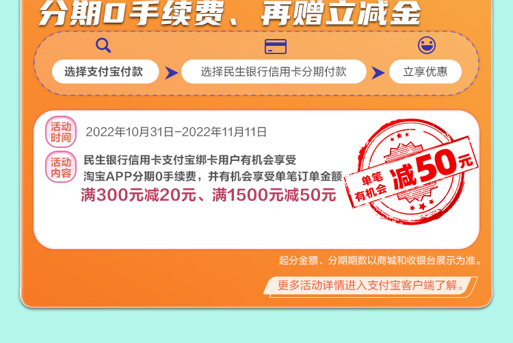 活动内容:民生信用卡持卡人在淘宝APP购买商品,使用支付宝绑定民生信用卡进行分期支付,可享3、6、12、24期0手续费,同时有机会享单笔订单金额满300元减20元(最高减20),满1500减50优惠(最高减50)。