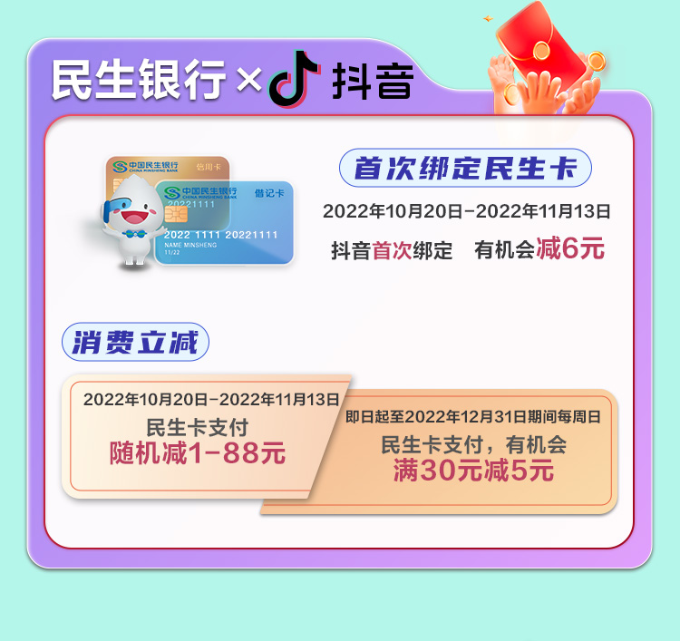 活动期间内,用户在抖音(含抖音火山版、抖音极速版、抖音盒子)客户端内关联的合众易宝支付账户绑定民生银行借记卡或信用卡,在电商购物场景、抖币充值场景及本地生活场景选择抖音支付并使用绑定的民生银行卡完成在线支付,可享单笔订单随机立减1-88元。