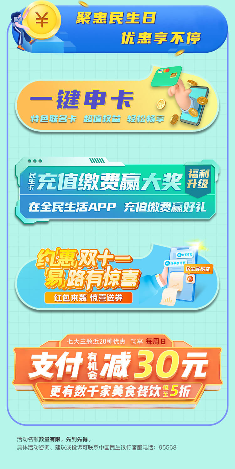 注:活动期间内,同一用户所绑定的民生借记卡或信用卡每周各限参与一次,借记卡活动期内共20000个活动名额,信用卡每日活动名额30000个,名额有限,先到先得,用完即止。