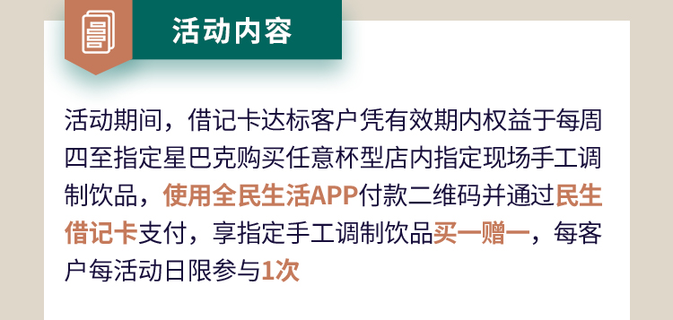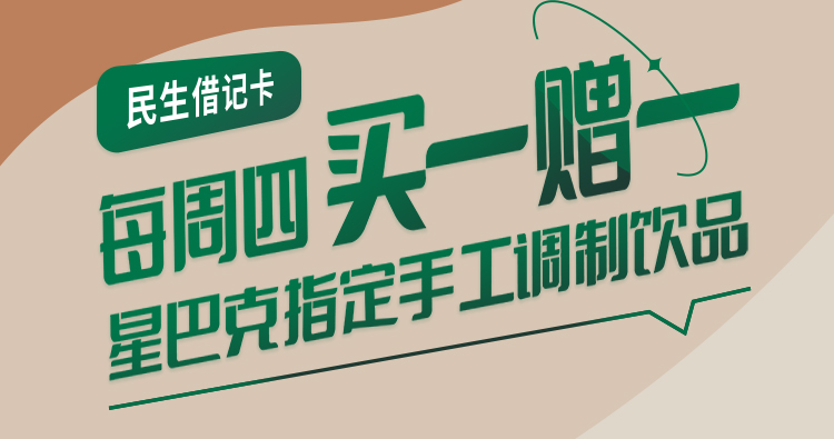 - 2.“买一赠一”指持卡人到店使用民生银行卡购买任意杯型的星巴克店内指定现场手工调制饮品一杯,可另免费获赠一杯零售价格不高于所购买杯饮品零售价的店内指定现场手工调制饮品,赠送的饮品不予开具发票。