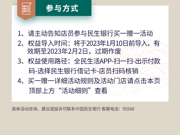 - 2)权益使用路径:全民生活APP—扫一扫—出示付款码—选择民生银行借记卡支付--店员扫码核销。