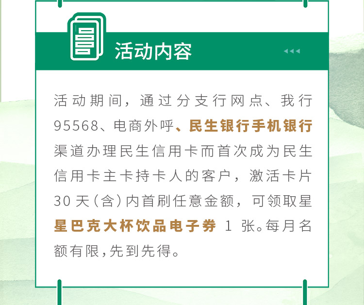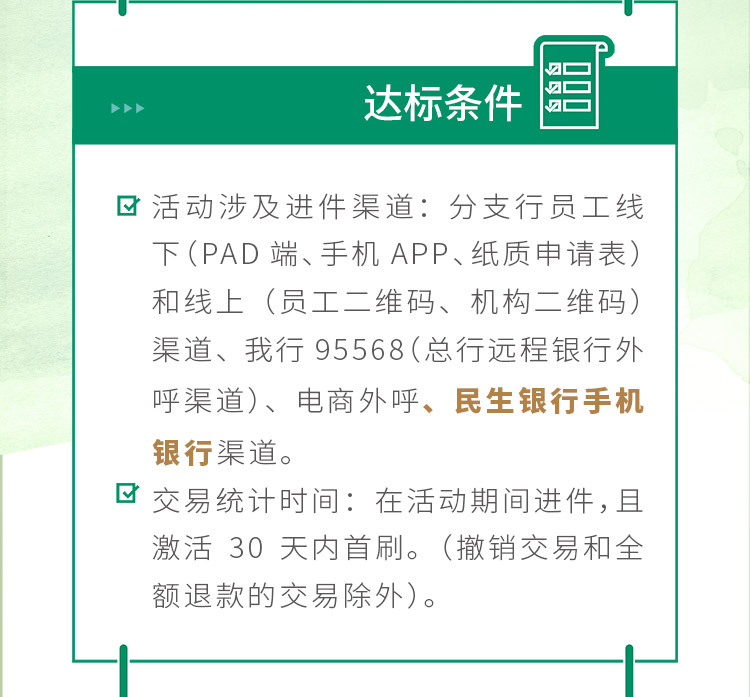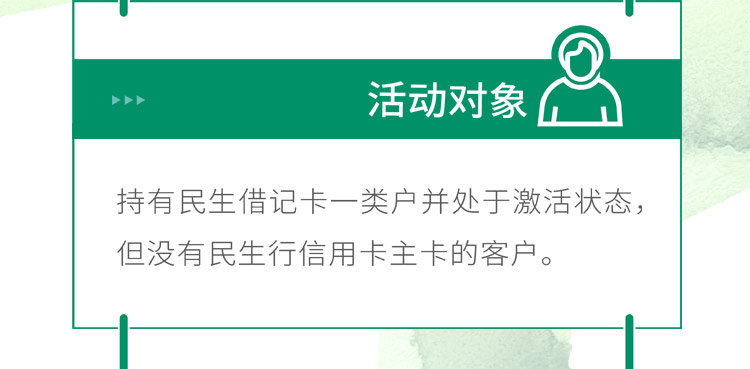 4、持卡人参与本活动即视为理解并同意本活动细则,活动内容及细则以民生信用卡官网公布为准。若持卡人对活动有异议,可在活动结束后30个自然日内联系我行,逾期将视为持卡人无异议,恕不受理。