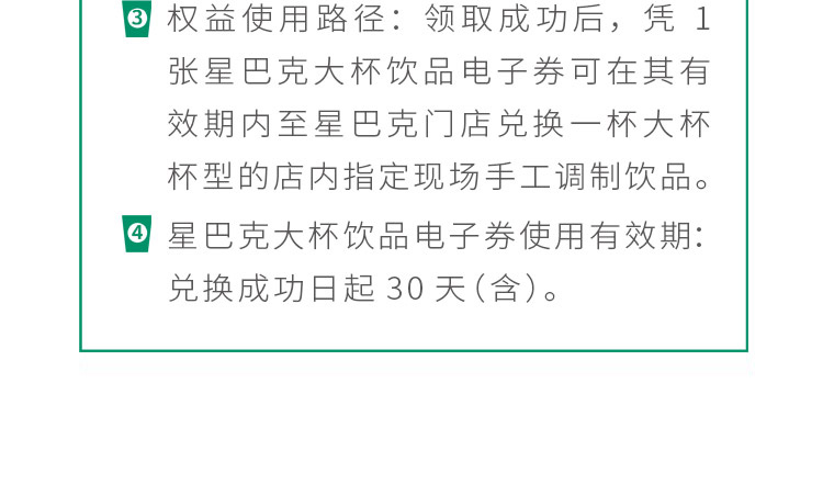 8、本电子券由星巴克(上海)商业有限公司发行,电子券在门店兑换饮品时如遇问题,请致电星巴克服务热线:400-820-6998。
