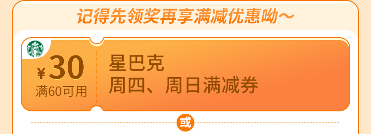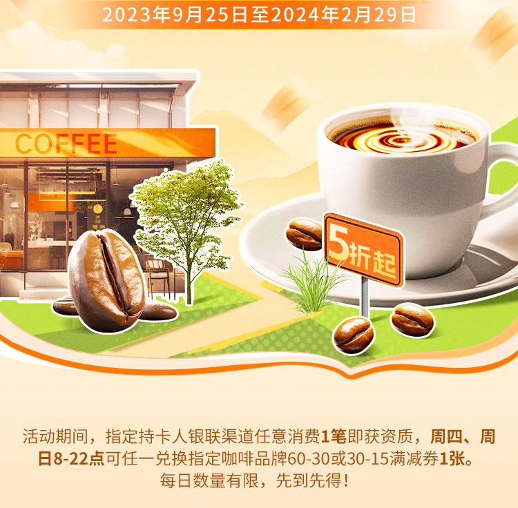 4.名额设置:星巴克60减30满减券每活动日名额9000个;Tims30减15满减券2023年12月31日前每活动日名额4500个,2024年1月1日后每活动日名额1000个,每日奖品数量有限,先到先得。每活动日名额视兑换及使用情况在总名额范围内酌情调整。