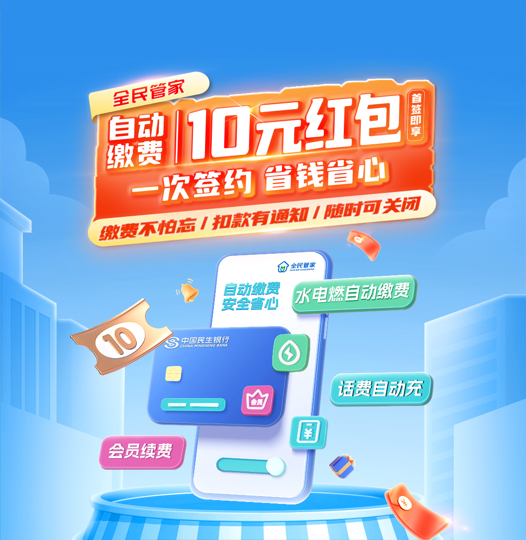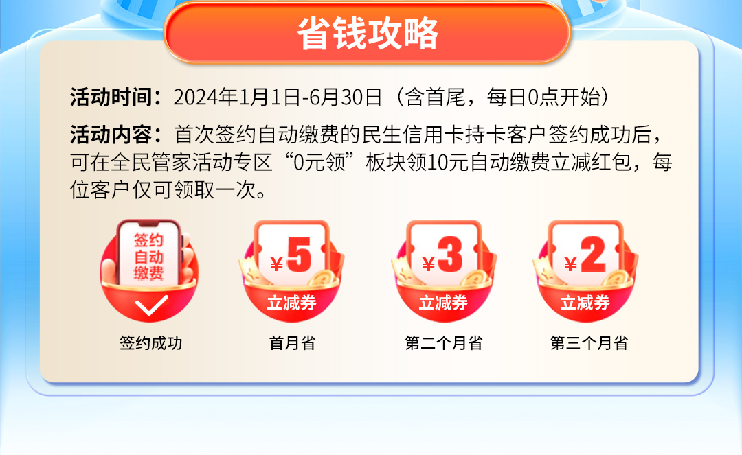 3.活动内容:活动期间,首次签约自动缴费的民生信用卡持卡客户签约成功后,可在全民管家活动专区“0元领”板块免费领取10元自动缴费立减红包,每位客户最多可领取一次红包,活动名额有限,先到先得。