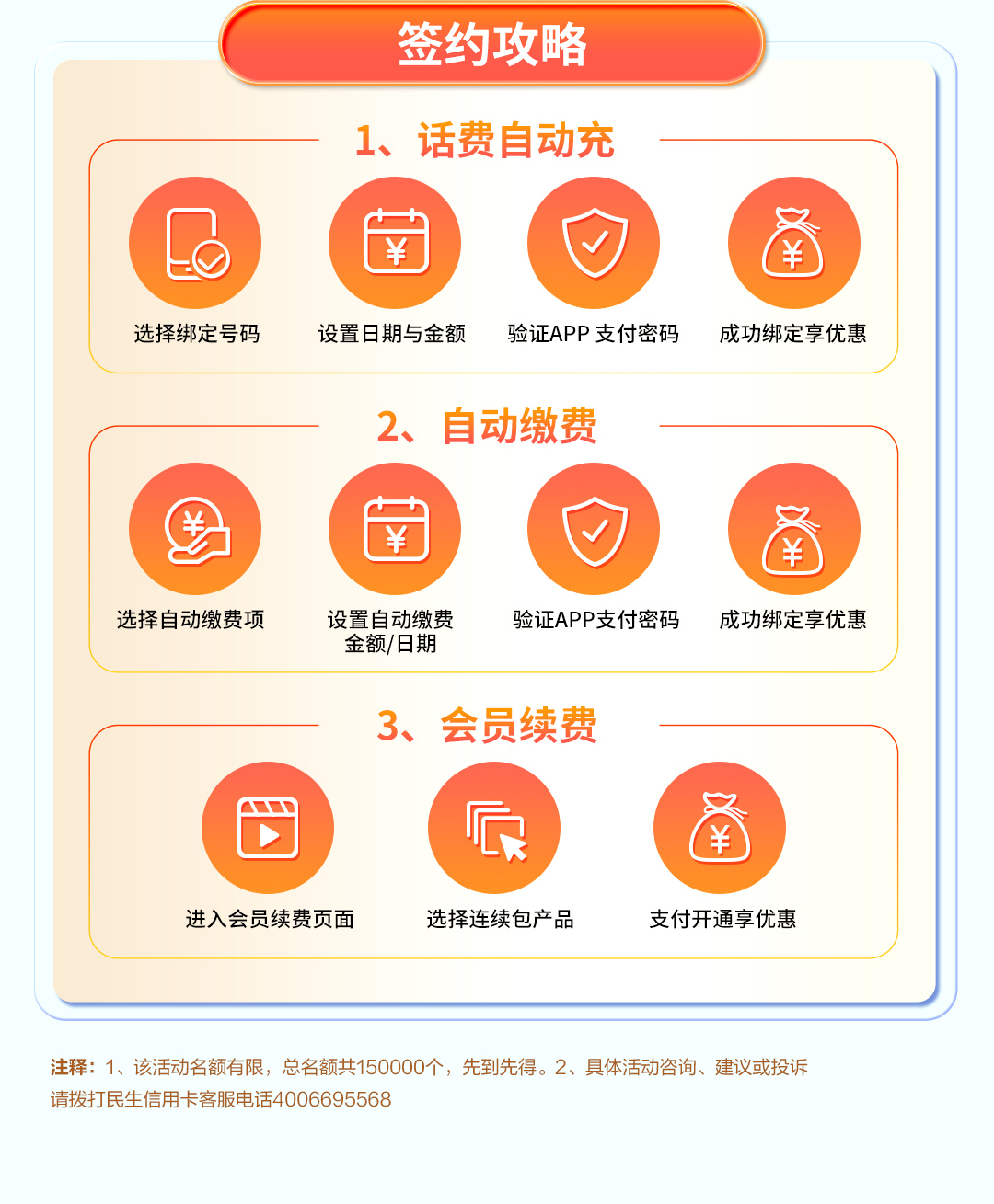 5.活动参与对象:首次签约全民管家(充值缴费)自动缴费的民生银行信用卡持卡客户。
