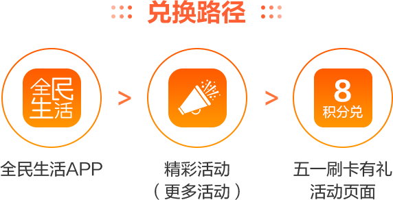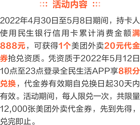 2. 资质查询及兑换路径:持卡人可于5月12日10点至23点通过全民生活APP-精彩活动-更多活动-“五一刷卡有礼-8积分兑美团外卖代金券”活动页面查看资质并进行抢兑,限量12,000张,每人限兑1张,先到先得。兑换需扣除8“优享积分或乐享积分”,若积分不足则视为自愿放弃兑换资质。