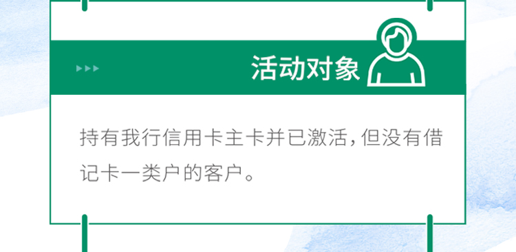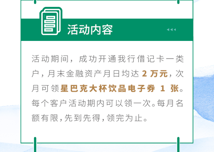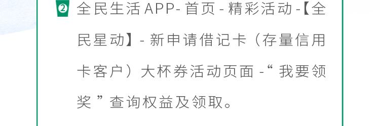 • 2、本次活动只针对个人消费行为,团购、单位或批发消费不参加此次活动。如因持卡人电子设备不支持、APP未更新到最新版本、网络信号等自身原因导致无法参与,我行后续不予补发;活动权益(大杯兑换券)限本人使用,如因自身保管不当导致券码丢失、被他人使用等,与银行无关,后续亦不予补发;请在各权益有效期内使用,过期作废。