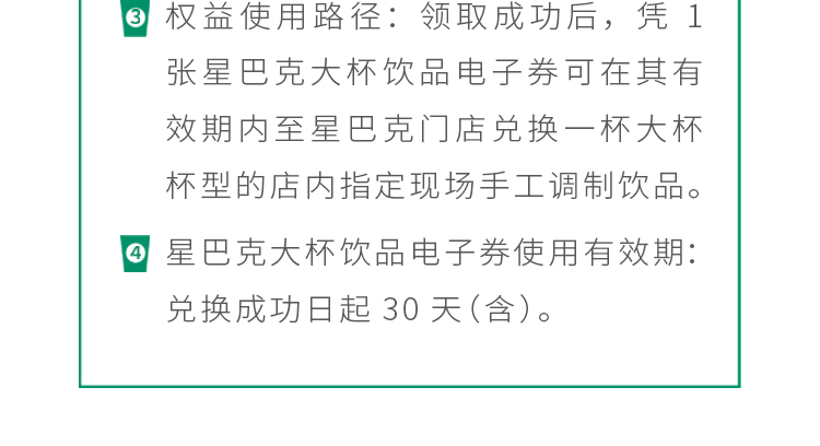 • 2、持卡人可凭电子券二维码在有效期内前往中国大陆地区指定星巴克门店兑换使用,商品供应以门店实际为准。