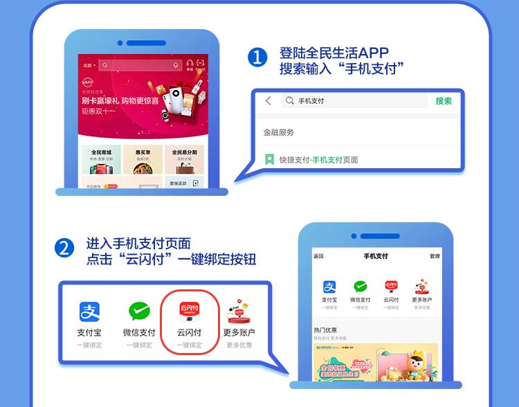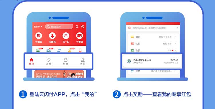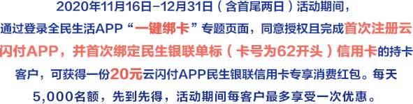 - 活动期间,通过全民生活APP“一键绑卡”专题页面,同意授权且完成首次注册云闪付APP并绑定我行民生银联单标(卡号为62开头)信用卡持卡客户,可获得一份20元云闪付APP民生银联单标(卡号为62开头)信用卡专享消费红包。云闪付新用户可通过短信验证码登录云闪付APP后,在云闪付APP——我的——奖励——我的红包——专享红包中查看。