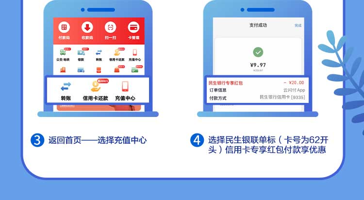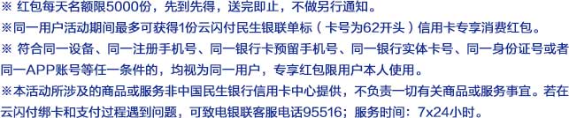 - 3、同一用户活动期间最多可获得1份云闪付民生银联单标(卡号为62开头)信用卡消费红包。