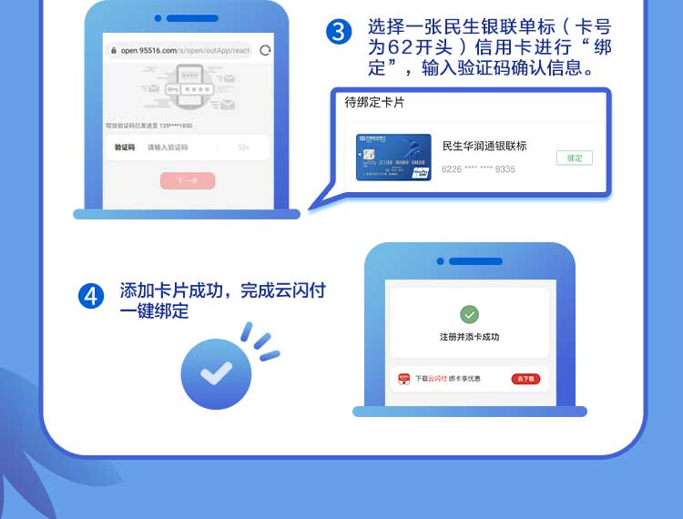 - 活动对象:首次注册且首次绑云闪付APP的民生银联单标(卡号为62开头)信用卡主附卡持卡人(公务卡、通宝白领、新e贷、银联双标卡、外币单标卡、汽车分期、泊车分期、居家乐、车主乐等大额分期信用卡或卡片账户状态不正常除外)。