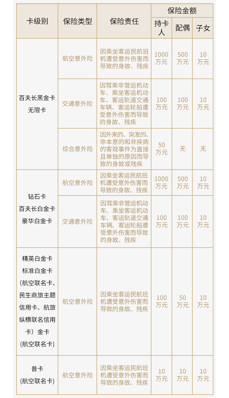 本网页公示的各项保险由中国太平洋财产保险股份有限公司北京分公司(以下简称“太平洋财险”)承保,咨询及理赔请致电太平洋财险服务专线95500。各卡级别保险责任详细如下: