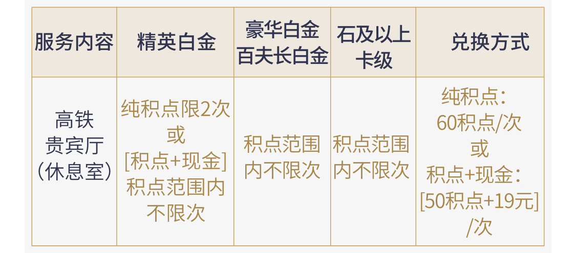 高铁贵宾厅(休息室)服务仅限精英白金卡及以上卡级持卡人本人及同行嘉宾使用。精英白金卡纯积点兑换限2次/自然年,豪华白金及以上卡级兑换积点范围内不限次,现金+积点兑换积点范围内不限次。