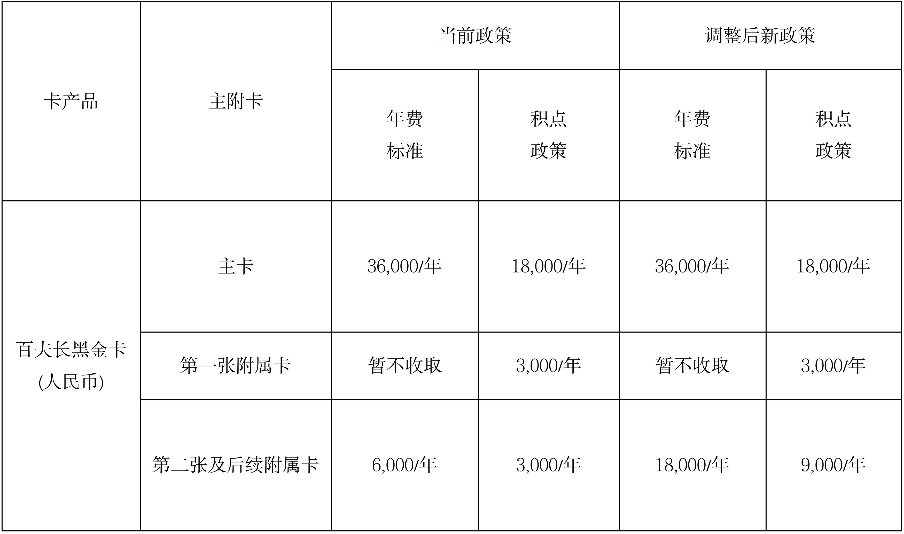 我行拟自2025年12月31日起调整民生美国运通®百夫长黑金卡(人民币卡)第二张及后续附属卡年费收取标准,现将调整情况公告如下: