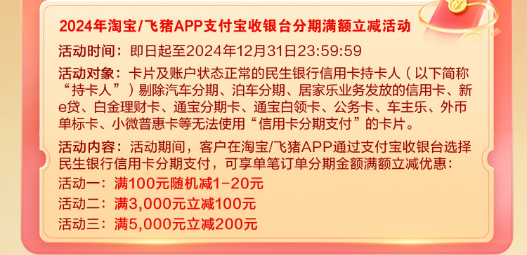 7.满减优惠无需单独领取,满足活动条件的持卡人可在支付宝收银台选择民生银行信用卡分期支付时直接享受活动优惠,减免金额直接抵扣面额对应的商品金额。