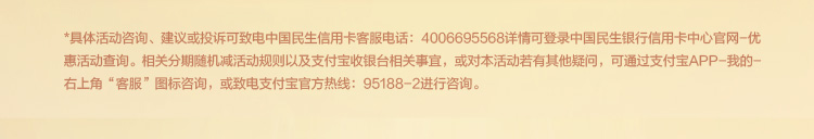 17.具体活动咨询、建议或投诉可致电中国民生信用卡客服电话:4006695568。详情可登录中国民生银行信用卡中心官网-优惠活动查询。相关分期满减活动规则以及支付宝收银台相关事宜,或对本活动若有其他疑问,也可通过支付宝APP-我的-右上角“客服”图标咨询,或致电支付宝官方热线:95188-2进行咨询。