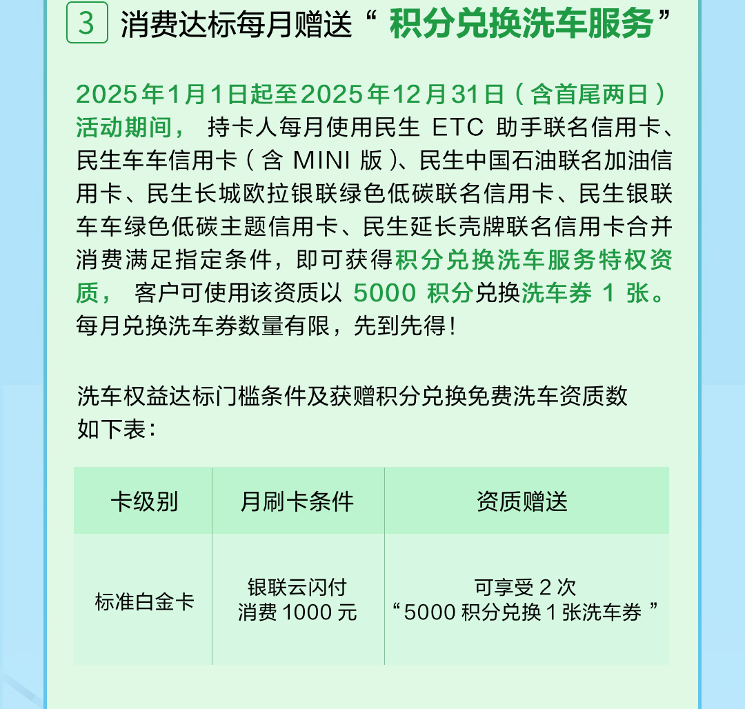 可享受2次“5000积分兑换1张洗车券” |