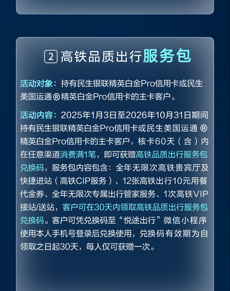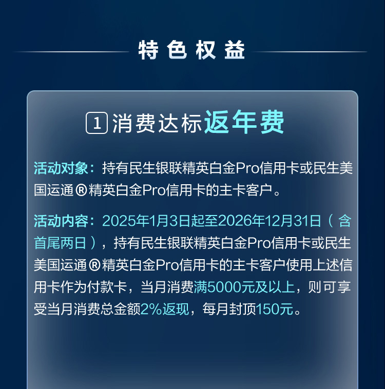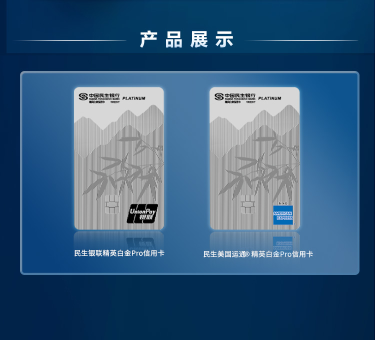 - 5、消费仅统计主卡持卡客户使用民生银联精英白金Pro信用卡或民生美国运通®精英白金Pro信用卡产生的交易,附属卡交易计入主卡。