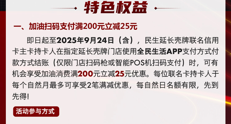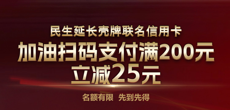 即日起至2025年9月24日(含),民生延长壳牌联名信用卡主卡持卡人在指定延长壳牌门店详见“延长壳牌直营门店列表”加油消费时,门店收银台使用扫码枪或智能POS机扫客户全民生活APP付款码支付加油费用时,需绑定并选择民生延长壳牌联名信用卡支付,可有机会享受加油消费满200元立减25元优惠。