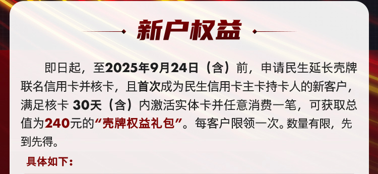 即日起至2025年9月24日(含)通过本渠道办理民生延长壳牌联名信用卡的新客户(不包括已持民生信用卡销卡后重新申请及核卡成功未激活的持卡人),可参与专属“壳牌权益礼包”活动。