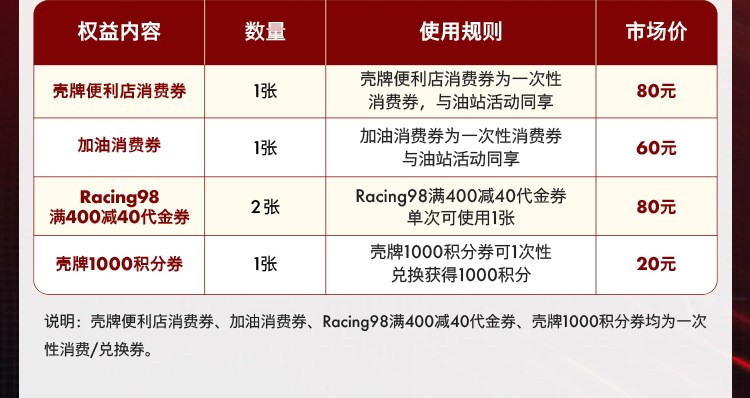 满足【达标要求】新客户,获赠专属“壳牌权益礼包”,包含①壳牌便利店80元消费券1张;②60元加油消费券1张;③Racing98满400减40代金券2张;④壳牌1000积分券1张。