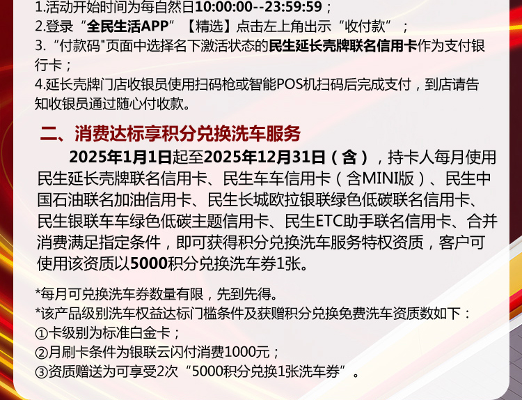2025年1月1日起至2025年12月31日(含),持卡人每月使用民生延长壳牌联名信用卡、民生车车信用卡(含MINI版)、民生中国石油联名加油信用卡、民生长城欧拉银联绿色低碳联名信用卡、民生银联车车绿色低碳主题信用卡、民生ETC助手联名信用卡、合并消费满足指定条件,即可获得积分兑换洗车服务特权资质,客户可使用该资质以5000积分兑换洗车券1张。