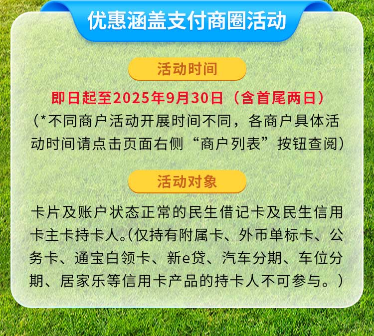 - 活动对象:卡片及账户状态正常的民生借记卡及民生信用卡主卡持卡人。