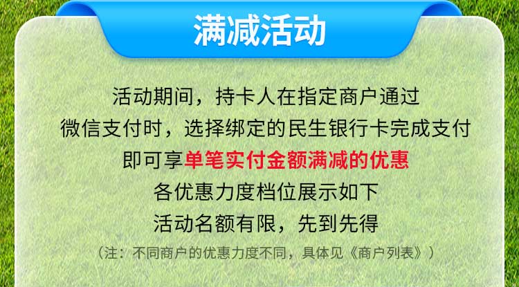 - 活动期间,持卡人在指定商户通过微信支付时,选择绑定的民生借记卡/信用卡完成支付,即可享单笔实付金额满减的优惠,满减力度分别为满15元减5元,满30元减10元,满50元减15元,满100元减30元。活动名额有限,先到先得。(注:不同商户的优惠力度不同,具体见《商户列表》)