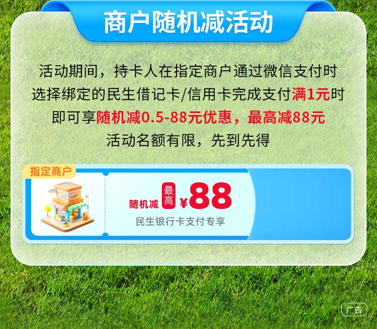 - 活动期间,持卡人在指定商户通过微信支付时,选择绑定的民生借记卡/信用卡完成支付满1元时,即可享随机减0.5-88元优惠,最高减88元。活动名额有限,先到先得。
