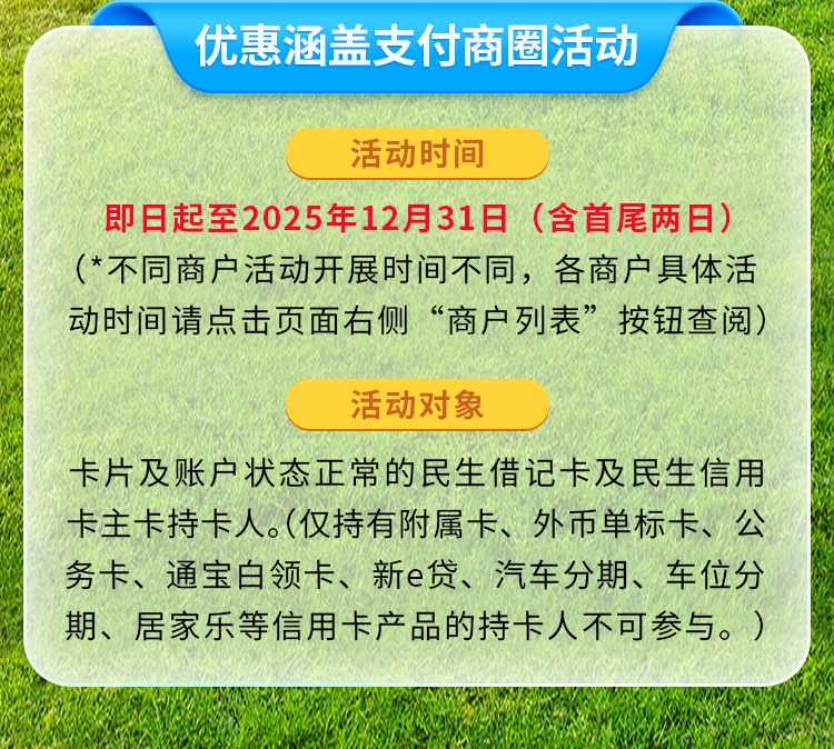 - 活动对象:卡片及账户状态正常的民生借记卡及民生信用卡主卡持卡人。