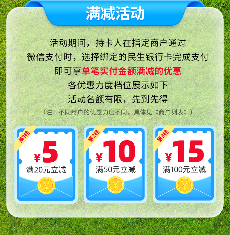 - 活动期间,持卡人在指定商户通过微信支付时,选择绑定的民生借记卡/信用卡完成支付,即可享单笔实付金额满减的优惠,满减力度分别为满20元减5元,满50元减10元,满100元减15元。活动名额有限,先到先得。(注:不同商户的优惠力度不同,具体见《商户列表》)