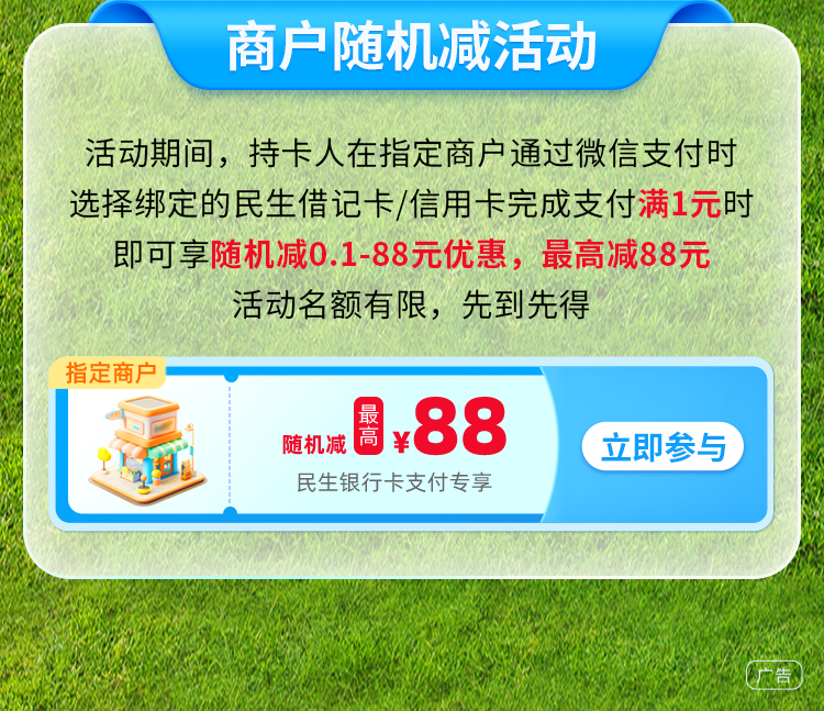 - 活动期间,持卡人在指定商户通过微信支付时,选择绑定的民生借记卡/信用卡完成支付满1元时,即可享随机减0.1-88元优惠,最高减88元。活动名额有限,先到先得。