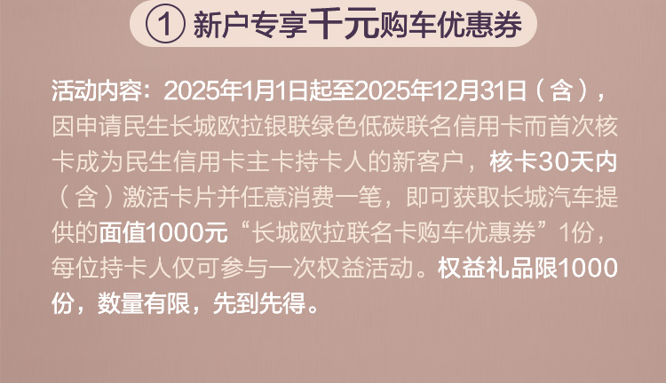 (8)优惠券使用渠道:客户前往欧拉ORA小程序首页将所持兑换码兑换为优惠券后,前往长城汽车指定门店购买欧拉品牌汽车时,在门店核实联名信用卡持卡人身份及优惠券信息后,即可享受1000元优惠。