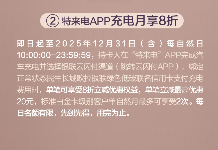 (一)如客户名下同时持有民生银联车车绿色低碳主题标准白金信用卡和民生长城欧拉银联绿色低碳联名信用卡,每自然月客户最多参与2次充电8折优惠权益活动。