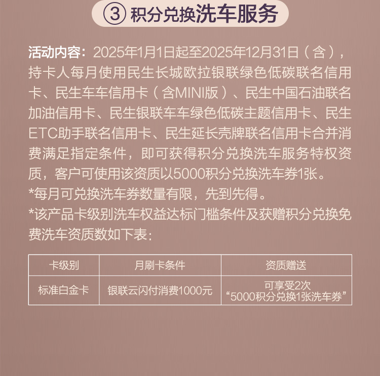1.积分兑换洗车服务特权资质统计及赠送以自然月为单位,持卡人满足活动达标条件后,积分兑换洗车服务特权资质将于次月10日(不含)前导入至持卡人洗车服务账户中。持卡人获赠的积分兑换洗车服务特权资质可用于以5000积分兑换免费洗车券1张。该活动每月与民生银联车车无界信用卡“2025年消费达标赠送免费洗车权益活动”共享20,000个洗车券兑换名额,数量有限,先到先得。