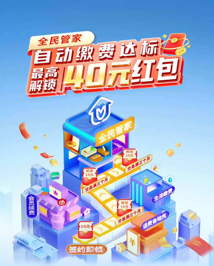 ②价值30元自动缴费立减红包:客户登陆全民生活APP-全民管家(充值缴费)-精彩活动-自动缴费板块,可领取3个10元自动缴费立减红包;客户在本年内同一自动缴费项交易满3个月即视为达标,即可解锁1个已领取的10元自动缴费立减红包,后续自动缴费扣款时即可使用;