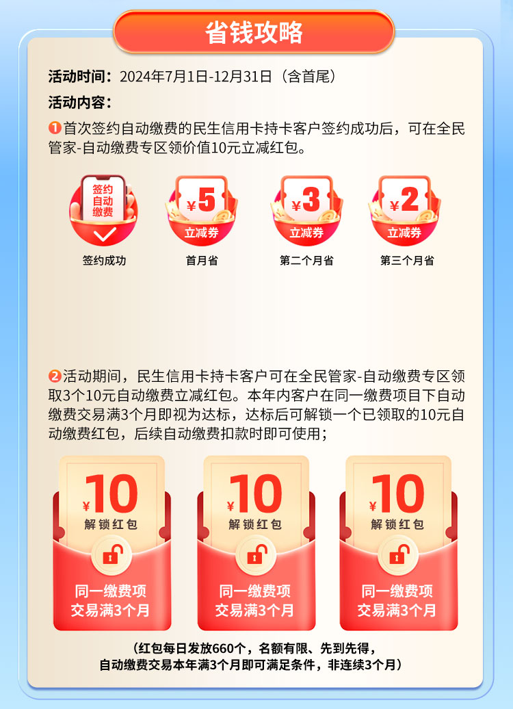 ②活动期间,民生信用卡持卡客户可在全民管家(充值缴费)自动缴费交易达标活动页面领取3个10元自动缴费立减红包。本年内客户在同一缴费项目下自动缴费交易满3个月即视为达标(可多个缴费项同时签约自动缴费、也可单个缴费项目连续达标),达标后即可解锁一个已领取的10元自动缴费立减红包,共可解锁3个10元红包,后续自动缴费扣款时即可使用;若客户未达标,则已领取的红包处于锁定状态,若在有效期内未解锁,则超出有效期后自动作废(红包有效期以页面展示为准)