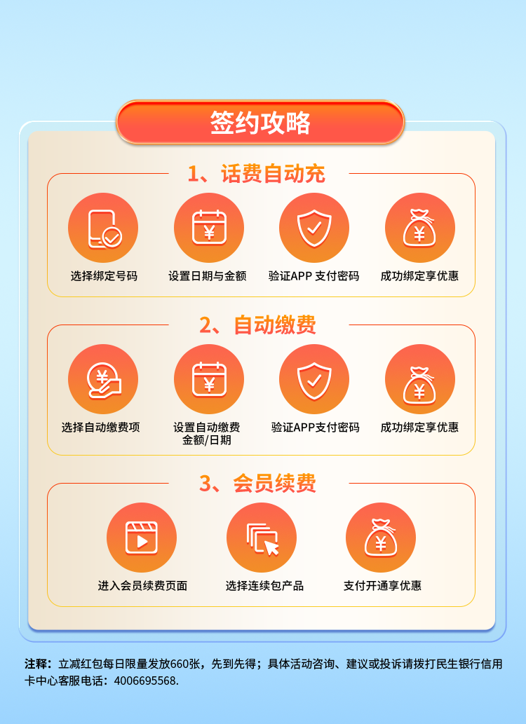 ①活动期间,首次签约自动缴费的民生信用卡持卡客户签约成功后,可在全民管家活动专区“0元领”板块免费领取10元自动缴费立减红包,每位客户最多可领取一次红包。